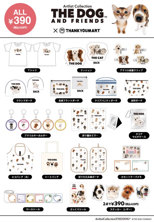 「Be Smile, Be Kawaii」をテーマに、キャラクターの限定アイテムを中心としたカワイイ推しグッズがいつ来てもALL390円で手に入るショップ「サンキューマート」は、2000年代に誕生したブランド「THE DOG」とのコラボレーション雑貨を、全国のサンキューマート店舗で4月下旬より入荷次第販売開始いたします。