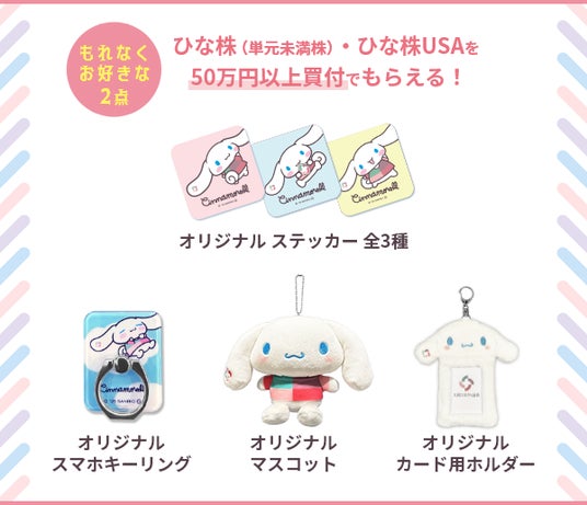 条件4.ひな株(単元未満株)・ひな株USAを50万円以上買付+エントリーいただいたお客さまに、もれなく「お好きなオリジナルグッズ2種」をプレゼント!!(※3)