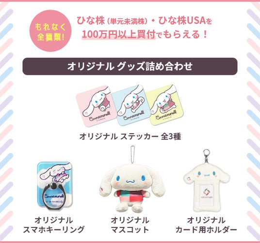 条件5.ひな株(単元未満株)・ひな株USAを100万円以上買付+エントリーいただいたお客さまに、もれなく「オリジナルグッズ詰め合わせ」をプレゼント!!(※4)