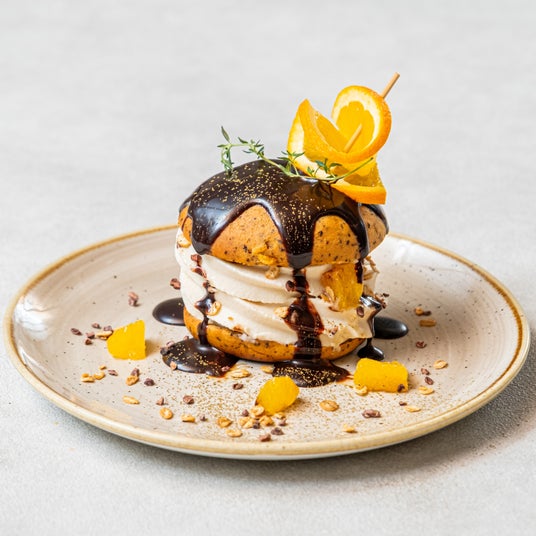 さらさらとほどけるようなくちどけ、豆乳であることを忘れるようなミルキーな風味と甘酒ならではの優しい甘さが特徴の自家製ソフトクリームを、カカオニブ・紅茶(ダージリン)パウダー・フレッシュオレンジと共に、小麦粉不使用のまるごと豆粉パン「ゼンブブレッド 紅茶&オレンジ」でサンド。トップにはビターで濃厚なチョコレートソースをたっぷりとかけました。