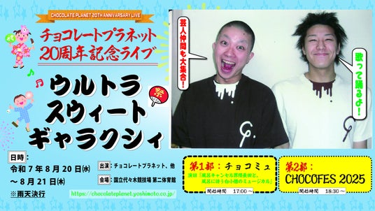 吉本興業所属のお笑いコンビ・チョコレートプラネットの結成20周年を記念したライブ “CHOCOLATE PLANET 20th ANNIVERSARY「ULTRA SWEET GALAXY」が、8月20日(水)、21日(木)に開催されます。