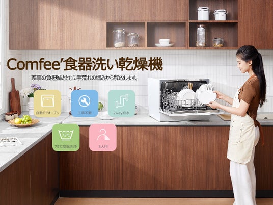 COMFEE'の食洗機は、自動ドアオープン機能で乾燥効率アップ!75℃高温洗浄&大容量で家族の食器もピカピカに。工事不要&節電設計も魅力!