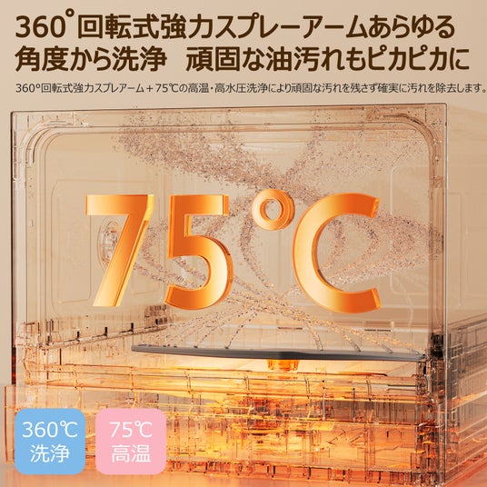 COMFEE'食洗機で、忙しい毎日をもっとラクに!最大5人分の食器が一度に洗える大容量なのに、コンパクト設計でスペースも無駄にしません。360°回転式強力スプレーアームが75℃の高温で油汚れを瞬時に除去し、食器はピカピカに!工事不要の2Way給水方法で、どこでも簡単に使え、お手入れ機能で庫内もいつでも清潔に。家事の時短&快適さを実現する、あなたのキッチンライフをサポートします!