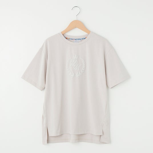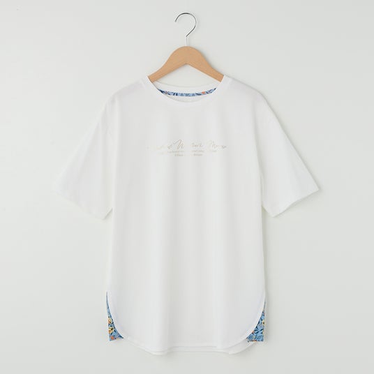 1.WMの文字をエンブレム調にデザインし、立体的な発泡プリントを施しています。体型カバーのできる前後差シルエットです。えりにウィリアム・モリスのプリントをさりげなく使用しました。