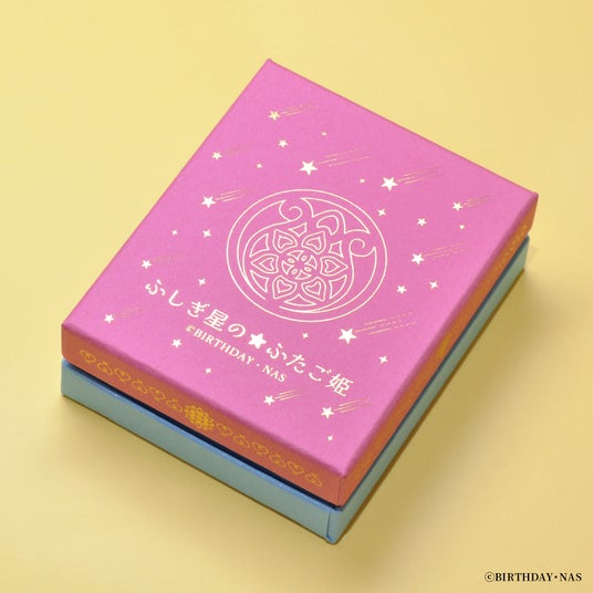 商品は、専用BOXにお包みしてお届け致します。ファインとレインをイメージしたカラーリングの流れ星が煌めくBOXです。フタ部分にはプロミネンスの紋章、側面には商品に登場するキャラクターの国の紋章を箔押しし、世界観を演出しています。