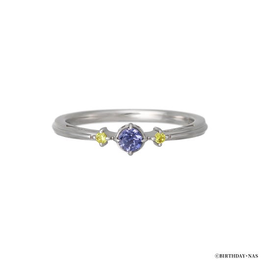 大人びていてクールなシェイドを、すっきりとしたストレートのアームとシャープな爪留めで表現し、石座の裏には「月の国」のマークを刻みました。瞳や髪の色を思わせる青紫のアイオライトと、黄色い服を表現したカラーストーンがきらめきます。石座とアームの側面にデザインされた服の柄や、内面の“SHADE”の刻印もさりげないポイントです。