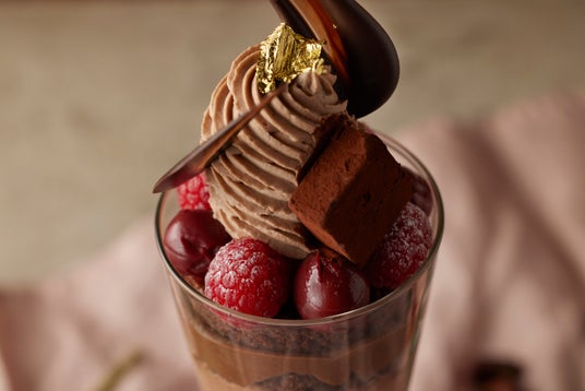 下層は、ほろ苦いコーヒーゼリーとまろやかな甘みのチョコレートパンナコッタを交互に流し込み、4層に仕上げました。その上にチョコレートアイスを重ね、サクサクのサブレとパールクラッカンを食感のアクセントに加えました。さらに、なめらかなチョコレートのカスタードクリームとスポンジを重ね、まるでケーキのような贅沢な味わいを演出。仕上げには、程よい酸味でチョコレートの魅力を引き立てるグリオットチェリーとフランボワーズを添え、チョコレートのシャンティークリームと、とろけるような生チョコレート、金箔を華やかに飾りました。
