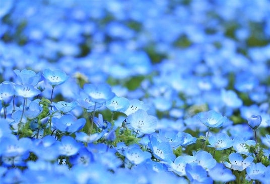 ネモフィラは、北アメリカ原産の一年草で和名を瑠璃(るり)唐草(からくさ)といい、草丈は20cmほどで細かく枝分かれし、横方向に広がりながら育ちます。花びらは中心が白く周りが青い、雲が浮かぶ青空のような綺麗な花を咲かせます。ネモフィラが空と繋がるように咲く青一面の風景が非常に“映える”ことから若年層を中心に話題となっています。