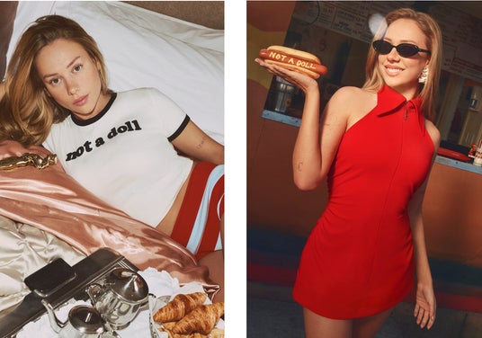 また、このコレクションのTシャツにはエステル自身の名言がプリントされており、「Not a Doll」や「Not Your Topic of Conversation」といった大胆なメッセージを発信。これは、他者の評価や体型にとらわれることなく、自分自身のために自由に着こなすという宣言であり、昨年末からエステルがSNSで発信し、話題となったメッセージ「Women grow, change, gain weight, and lose weight. We are not dolls.(女性は成長し、変化し、体重が増えたり減ったりする。私たちは人形ではない)」にも通じるものです。女性が抑圧的な型に囚われず、他者の批判に対抗する権利を訴える呼びかけとして捉えられています。