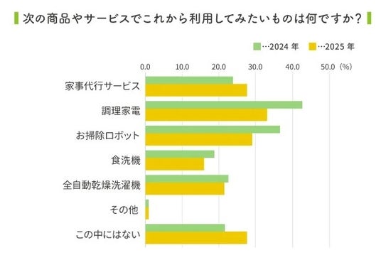 唯一、前年からポイントを伸ばしているのは「家事代行(2024年:23.9%→2025年:27.6%)」。自分で管理する「調理家電(2024年:42.5%→2025年:33.1%)」や「食洗機(2024年:18.7%→2025年:15.9%)」も良いけれど「まるごと誰かに任せてしまいたい!」という気持ちもあるのかも?