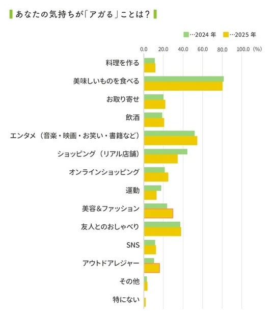 毎日1~2時間の自由時間のあいだに、皆さんは何をしてリフレッシュしているのでしょうか?「あなたの気持ちが”アガる”こと」についてアンケートを取ると、「美味しいものを食べる(80.7%)」がトップになりました。続いて、映画や音楽といった「エンタメ(54.5%)」や「友人とのおしゃべり(37.9%)」と続きます。具体的には「推し活」とコメントしてくださる方もチラホラ。