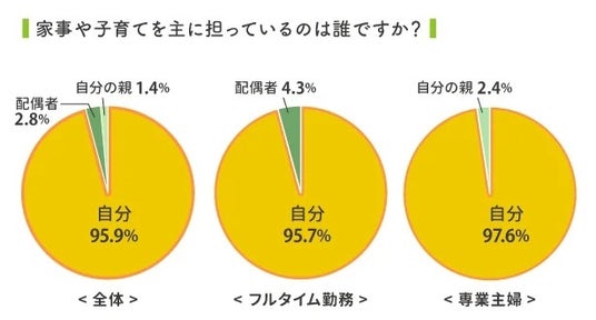 ・ワーキングマザーの95%が、家事や育児を担当。専業主婦と大差ない結果に