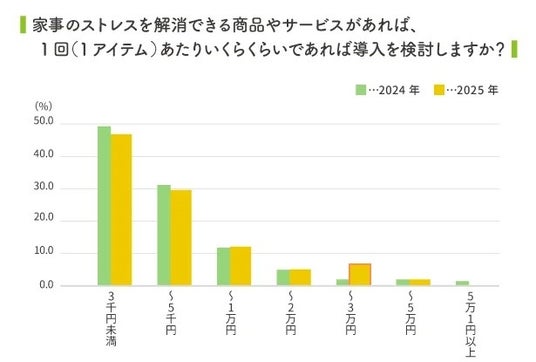 前年度から下がっていたのは、ボリュームゾーンの「3,000円未満(2024年:49.3%→2025年:46.9%)」「3,000~5,000円(2024年:30.6%→2025年:29.7%)」となりました。逆に「3万円」については前年度から4.7ポイントもアップ。(2024年:1.5%→2025年:6.2%)家事の負担を軽減できるならば、高額な費用をかけても構わないと考えている方が増えていそうです。