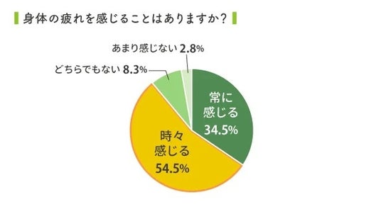回答者の9割が疲れを感じているという回答が集まりました。(「常に感じる34.5%」「時々感じる54.5%」)続いて「どちらでもない」は8.3%、「あまり感じない」は2.8%のみ、「まったく感じない」に至っては回答者はゼロとの結果に。