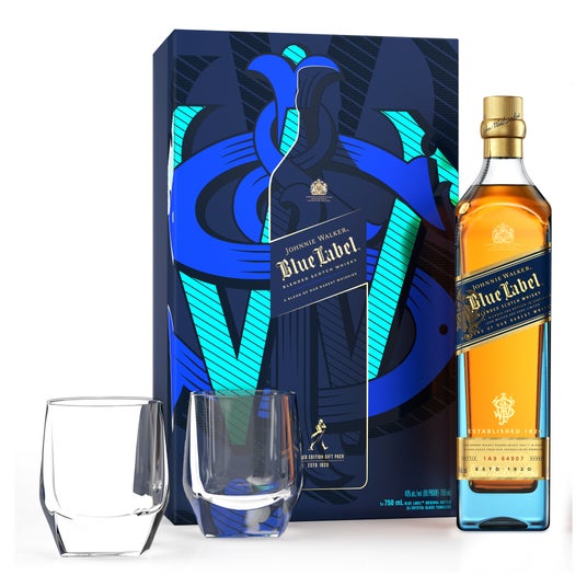 本商品は、ジョニーウォーカーがもつ、他の追随を許さないほど豊富なウイスキーの貯蔵庫から選び抜かれた、10,000樽に1樽の割合でしか存在しない希少な原酒をブレンドした「ジョニーウォーカー ブルーラベル」に、特製クリスタルグラスタンブラー2個をセットにした、ラグジュアリーなギフトボックスです。ラグジュアリースコッチの象徴のブルーラベルを、専用グラスでお楽しみいただける、贈答品にふさわしい数量限定の商品となっています。
