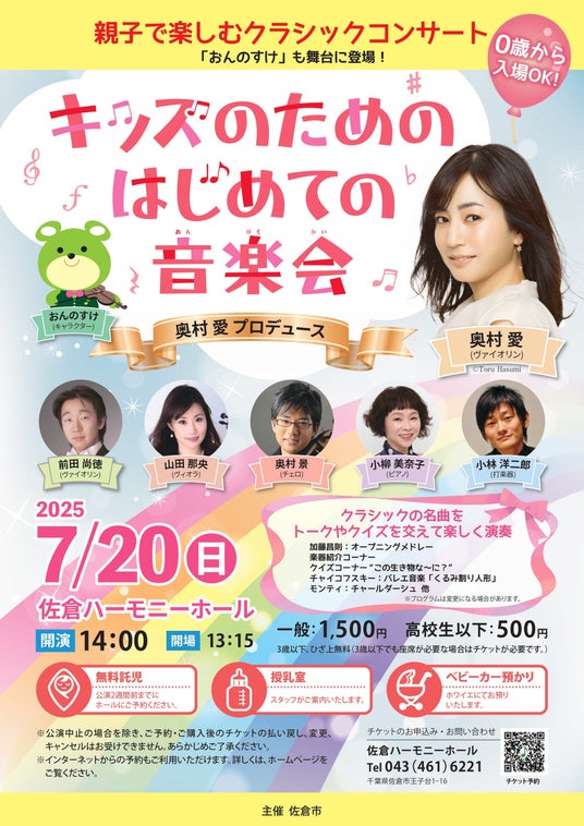 【千葉県佐倉市】7/20開催、キッズのためのはじめての音楽会(奥村愛プロデュース) チケット予約開始