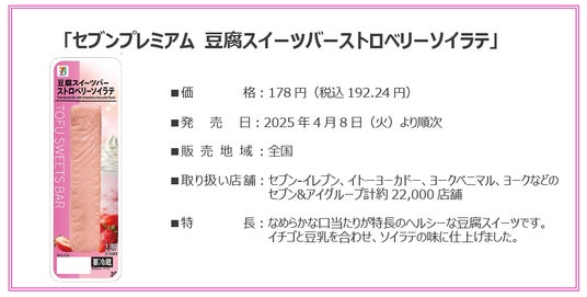 株式会社セブン&アイ・ホールディングス(本社:東京都千代田区、代表取締役社長:井阪 隆一)は、セブンプレミアムで人気の「豆腐スイーツバー」シリーズから、新商品「セブンプレミアム 豆腐スイーツバーストロベリーソイラテ」を2025年4月8日(火)より、全国のセブン-イレブン、イトーヨーカドー、ヨークベニマル、ヨークなど約22,000店舗で順次発売いたします。