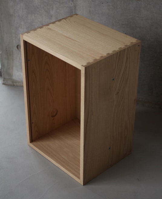 当社では、1990年代から収納家具の引き出し作りの一部にこの技法を導入。通常の霰組(あられぐみ)とは異なり、嵌合後は抜けにくく、見る角度によっては接合部が目立たないという特長を持ちます。特に、引き出しのように力のかかる方向が決まっている構造において、高い強度と耐久性を発揮します。