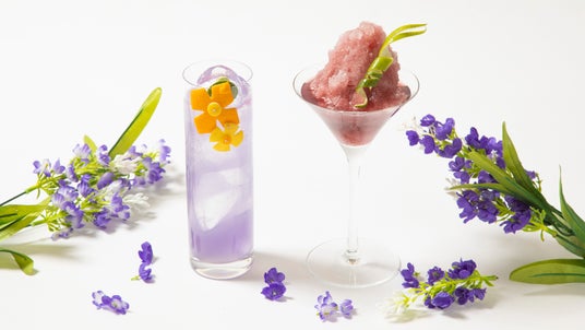 クラフトジンを使用した”ライラック ファンタジーフィズ”(写真左)や、お酒が苦手な方も安心なフローズン・スタイルのノンアルコールカクテル”ライラック ルンルン♪フローズン”(写真右)もご用意しております。