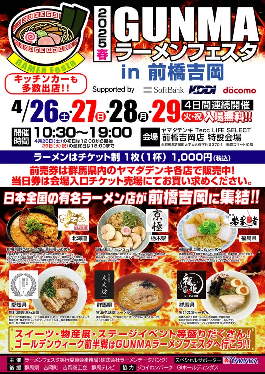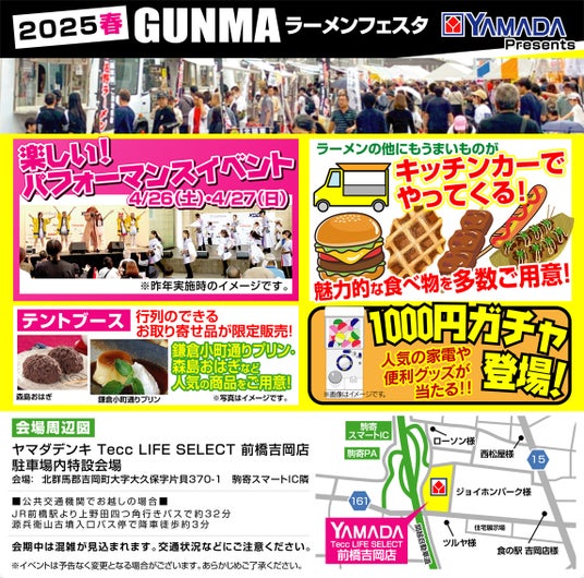 株式会社ヤマダホールディングスのグループ企業である株式会社ヤマダデンキ(本社:群馬県高崎市、代表取締役社長:佐野 財丈、以下、ヤマダデンキ)は、2025年4月26日(土)より開催される「GUNMAラーメンフェスタ 2025 in 前橋吉岡」に運営協力いたします。