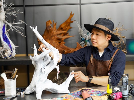 本展示ではyuhakuのグラデーションレザーからインスピレーションを受けて制作した新作アートとコラボアイテムを多数発表。yuhaku製品の持つ美しい色彩から、深海や夜空、山々で凛と生きる木々といったイメージを受け、この地球上に存在する命に重きを置いて表現されています。