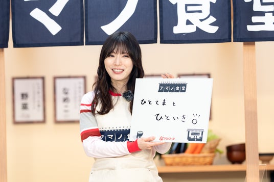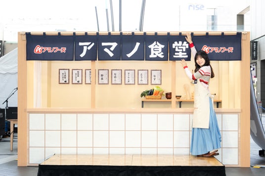 イベントのオープンを祝した「のれん掛けセレモニー」では、「アマノ食堂オープン!」の掛け声とともにのれんを掛け、「とてもかわいい食堂になっていますので、ぜひたくさんの方に『アマノ食堂』を楽しんでいただきたいと思います!」と笑顔で意気込みを語りました。