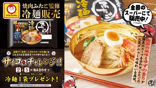 「大阪焼肉・ホルモン ふたご」の大人気メニュー「名物!!こだわりの一口冷麺」を注文して頂いたお客様にサイコロを振っていただき、『2』と『5』(ふたご)がでたら新商品のチルド麺「マルちゃん 『大阪焼肉・ホルモン ふたご』監修 冷麺 2人前」をまるごと1袋プレゼントする期間限定イベントを4月10日(木)より国内全店舗で開催します。常温保存が可能な商品となっておりますので、家に帰ってから「名物!!こだわりの一口冷麺」の味を思い出しながらお召し上がりいただければと思います。
