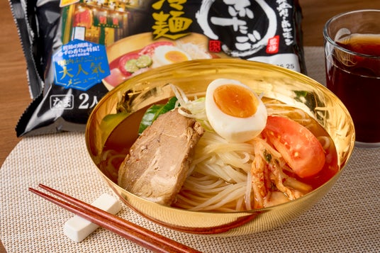 「大阪焼肉・ホルモン ふたご」の大人気メニュー「名物!!こだわりの一口冷麺」の味わいをチルド麺で再現。弾力のあるなめらかな麺に、鰹節の風味とゆずの香りが特長のスープを合わせ、同店の人気メニューの味わいを再現しました。定番トッピングのきゅうり・たまご・キムチだけでなく、梅としそを加え「梅しそ冷麺」などにアレンジしてもおいしくお召しあがりいただけます。