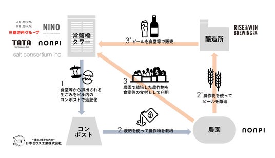 このビールは、スペックと三菱地所のサステナブルな取り組みから生まれました。常盤橋タワー内で発生した生ごみをコンポスト化し、そこから生成された液肥を活用し育てたreRise食材を使用。