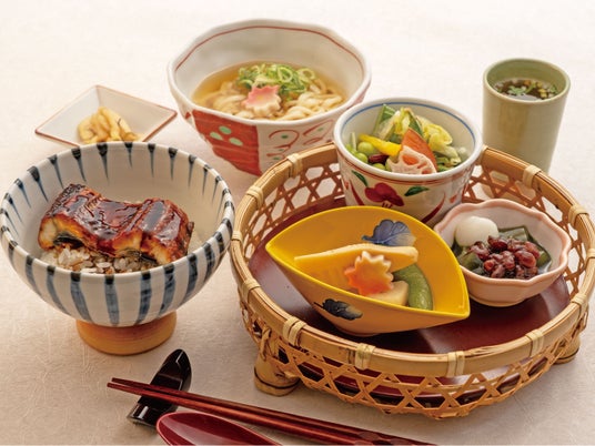 ●小さなうなぎ丼のかご盛りセット 1,482円(税込み1,630円)少しずついろんなおいしさが楽しめることで人気の、かご盛りセット!特製お出汁で仕上げた炊き合わせは、季節ごとに変わる食材で季節の移ろいをお楽しみください。一口サイズのプチ甘味がついて、食後の一息にもぴったりです。