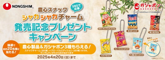 株式会社農心ジャパン(本社:東京都千代田区、代表取締役社長:金大廈)は、株式会社農心(韓国)と株式会社バンダイ(本社:東京都台東区)のカプセルトイブランド「ガシャポン(R)」とのコラボ商品『農心スナック シャカシャカチャーム』の発売を記念し、4月11日(金)から4月20日(日)にSNSキャンペーンを開催します。期間中、Instagram・Xでご応募いただいた方から抽選で合計20名様に、2025年2月に発売を開始した『農心 チャームコレクション(グローバルエディション)』、およびこのたび2025年4月に新発売する『農心スナック シャカシャカチャーム』のガシャポン(R)と、実際の製品がセットで当たります。