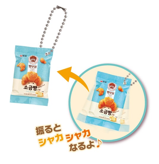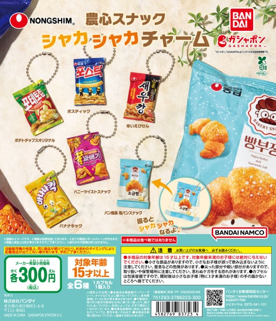 このたび新発売する、農心(韓国)監修第2弾ガシャポン(R)『農心スナック シャカシャカチャーム』では、ラーメンではなくスナック製品が初めて登場。「ポテトチップスオリジナル」「ポスティック」「辛いえびせん」「バナナキック」「ハニーツイストスナック」「パン部長 塩パンスナック」の全6種を展開します。振るとスナック菓子らしく、シャカシャカと音が鳴る楽しい仕掛けにもご注目ください。