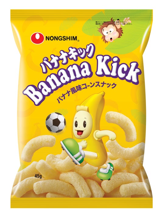 「バナナキック」バナナの味がそのまま活きているコーンスナック。とろっと溶けて、口いっぱいにバナナの味が広がる贅沢な味わいです。韓国では子供から大人まで幅広い方々に愛されている人気製品です。