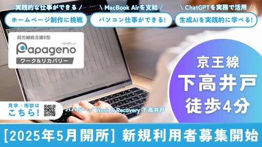 企業のDX支援や、精神・発達障害のある方の就労支援サービスを運営する株式会社パパゲーノ(本社:東京都杉並区、代表取締役:田中 康雅)は、「パパゲーノ Work & Recovery 下高井戸(就労継続支援B型)」を、新規施設外就労先(※)として2025年5月に開所いたします。本日より利用希望の受付を開始することをお知らせします。