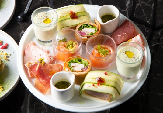 スタンド上段には、京都の老舗日本茶専門店 放香堂の抹茶をはじめとする風味の強い宇治抹茶を使った、水晶餅のロールケーキや、富良野メロンジュレを包んだムースケーキ、濃厚なクレームブリュレなど全5種のガトーがラインナップ。レストランならではのこだわりのセイボリーが楽しめるのも、当店のアフタヌーンティーの魅力の一つ。チミチュリソースをかけて食べるそば粉のガレットロールや、マグロのカツレツサンドなど、口福なメニューの数々をご堪能ください。さらに、高級紅茶スティーブンスミスティーメーカー・ロースタリー直送コーヒーや茶師が厳選した日本茶(放香堂)などがフリーフローでお楽しみいただける全長10メートルの世界一のドリンクバー(商品名:ビバレッジバー)が付いており、時間無制限で優雅な春のティータイムをお過ごしいただけます