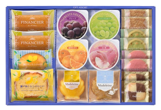 内容:フリュイジュレ(グレープ、白桃、温州みかん、シャインマスカット)各1個、フィナンシェ 2個、瀬戸内レモンケーキ、瀬戸内レモンパウンド 各1個、バターマドレーヌ、アールグレイマドレーヌ 各1個、クッキー(シナモン、ピスターチ、チェック、フランボワーズ)各2個
