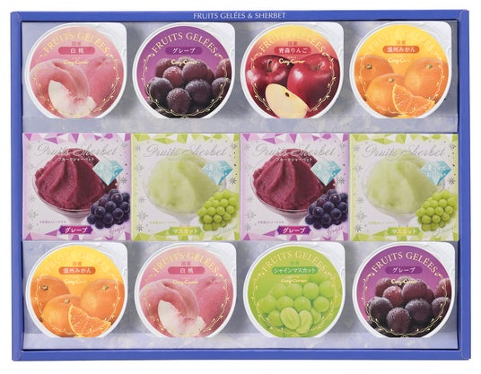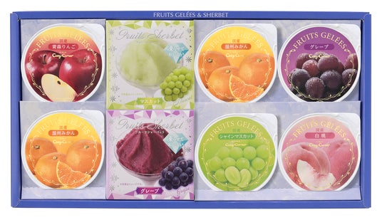 ●8個入:フリュイジュレ(温州みかん)2個、フリュイジュレ(白桃、青森りんご、グレープ、シャインマスカット)各1個、フルーツシャーベット(マスカット、グレープ)各1個