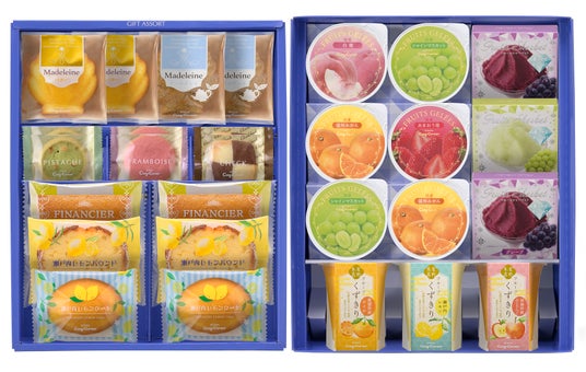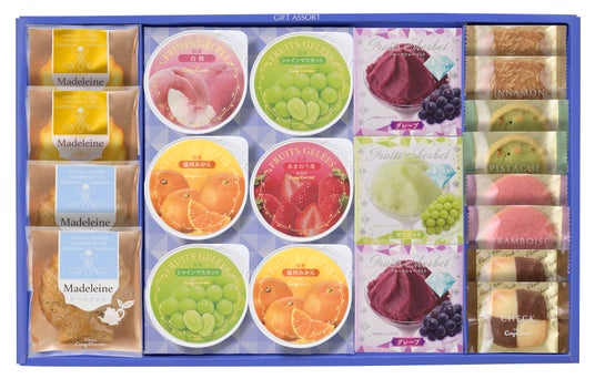 内容:フリュイジュレ(シャインマスカット、温州みかん)各2個、フリュイジュレ(あまおう苺、白桃)各1個、フルーツシャーベット(マスカット)1個、フルーツシャーベット(グレープ)2個、フルーツくずきり(瀬戸内レモン、青森県産ふじりんご、愛媛県産せとか) 各1個、フィナンシェ、瀬戸内レモンケーキ、瀬戸内レモンパウンド 各2個、バターマドレーヌ、アールグレイマドレーヌ 各2個、クッキー(ピスターチ、チェック、フランボワーズ)各2個