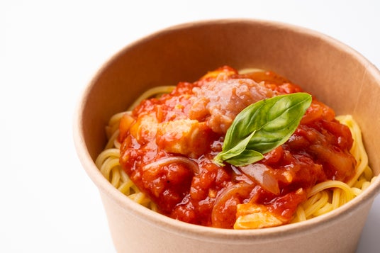 「梅とトマトのパスタ」トマトソースに梅肉を和えた濃厚でさわやかな味わいのソースに、ジューシーな鶏肉と玉ねぎを加えた一品です。
