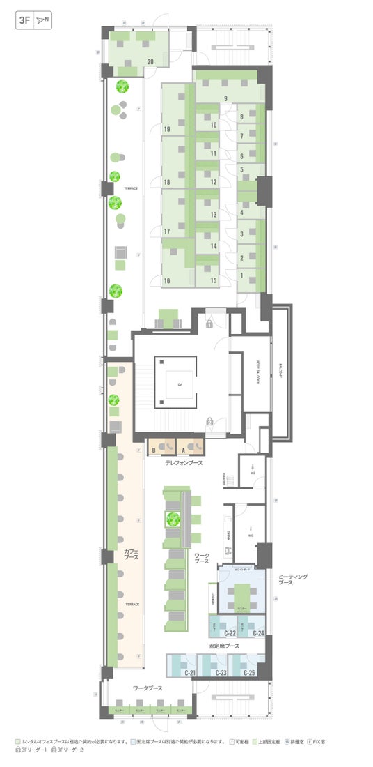 席数:【コワーキングスペース】オープンスペース24席/固定席5席 【レンタルオフィス】20戸