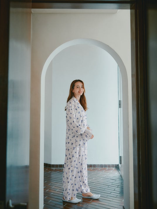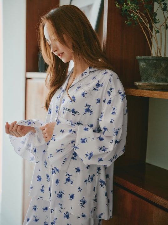 繊細かつ鮮やかなコバルトブルーの花柄をプリントした、袖口にギャザーをあしらいふんわりとフェミニンなシルエットに仕上げたサテンシャツ。袖はゴム入りなので水仕事などの際にさっとまくれる機能性もポイントです。