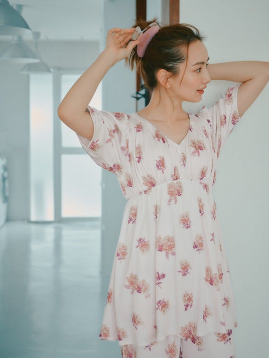 柔らかなカットソー素材のプルオーバーには、優しいコーラルカラーのローズ柄をプリント。ゆったりと開けたVネックと、胸下からギャザーを入れたふんわりとしたシルエットがフェミニンなアイテム。取り外せるカップ付きで、1枚でさらりと着用できます。