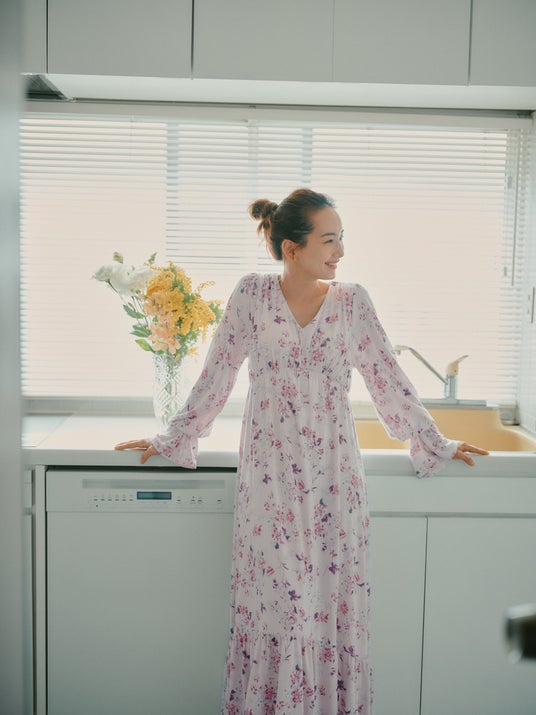 ピンク系の花柄を散りばめた、柔らかなカットソー素材の長袖ワンピース。首元はゆったりと開けたVネックで、胸元にはギャザーをたっぷり効かせたロマンティックなシルエット。袖口はゴム入りなので、さっとまくることもでき便利です。取り外せるカップ付きで、1枚でさらりと着用できます。