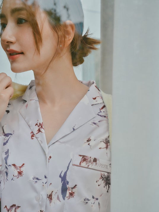 アンニュイなカラーリングの花を総柄プリントした、ほのかな光沢感となめらかさが魅力のサテンシャツ。品のある配色パイピングと胸ポケットのロゴ刺繍、大人っぽいざっくりとしたシルエットでスタイリッシュに着こなせます。