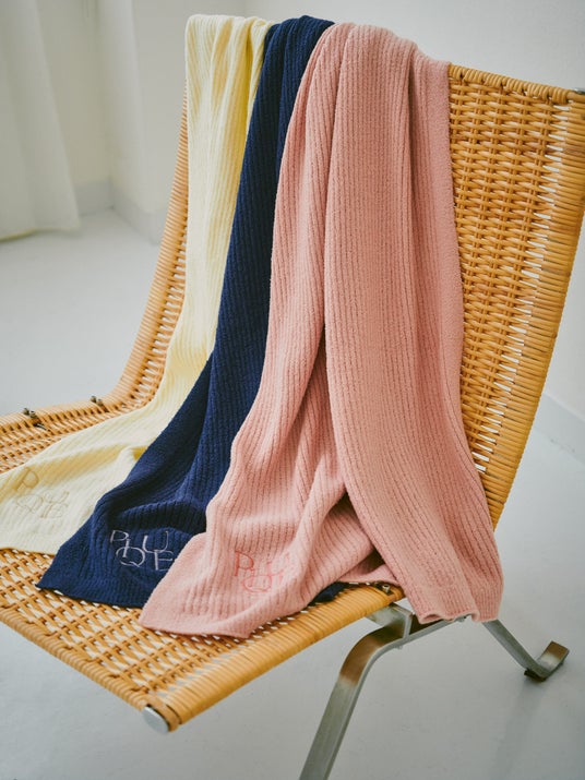 リブ編みがスタイリッシュな印象を放つ、ふんわりと柔らかな手触りが心地よいブランケット。気持ちまで明るくなるようなカラーリングと、大きめのロゴ刺繍がポイント。75×120cmのコンパクトなサイズで、肩や膝にさらりと掛けてご使用いただけます。