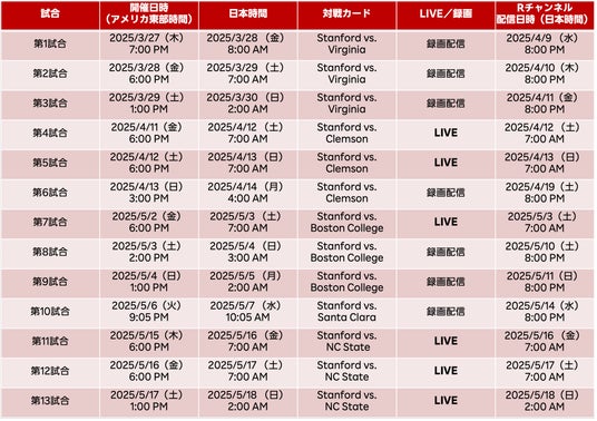 「Rチャンネル」では、「SPECIAL LIVE」チャンネルにてレギュラーシーズン13試合のうち6試合をライブ中継、7試合を録画にて配信し、4月12日(土)・13日(日)の試合は日本語実況付きでライブ中継にて配信を予定しています。また、レギュラーシーズン終了後、5月20日(現地時間)から予定している「ACCトーナメント」についても、スタンフォード大学戦を配信予定です。なお、「Rチャンネル」で米大学野球のライブ配信を行うのは初めてとなります。