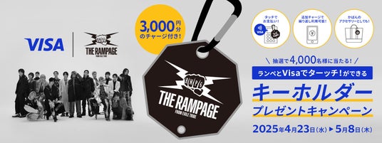 本企画は、今年1月に「大阪エリア振興プロジェクト」の応援企画として、大阪・関西万博のスペシャルサポーターを務め、若年層をはじめ幅広い世代から人気を誇るTHE RAMPAGEと共に立ち上げたプロジェクトです。この度、第2弾として、「ランペとVisaでターッチ!ができるキーホルダープレゼント」キャンペーンを、4月23日から5月8日までの16日間実施いたします。キャンペーンに応募いただいた方の中から、抽選で4,000名にTHE RAMPAGEロゴ入りのキーホルダー式Visaプリペイド(3,000円分チャージ済)が当たります。