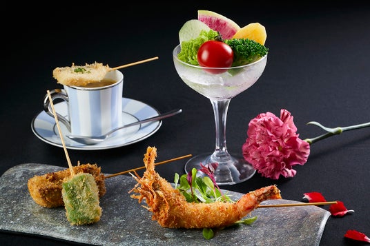 モダンで大胆なアレンジを加えた創作串揚げを、ワイン・スペクテーター誌のAward of Excellenceを受賞したワインリストと共にご堪能ください。‟ワールドトラベルシリーズ”では、季節ごとに世界有数のワイン産地をテーマに据え、ホテルソムリエが選ぶワインと極上の串のペアリングが、皆さまを食の旅へとお連れいたします。