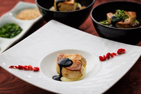 「フォワグラ丼 テリヤキソース」または「フォワグラのソテー バルサミコソース 苺の香り」