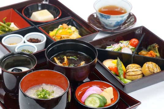 お粥や主菜、季節のお浸しなどの副菜ほか、デザートまでついた折衷精進料理をお楽しみいただきます